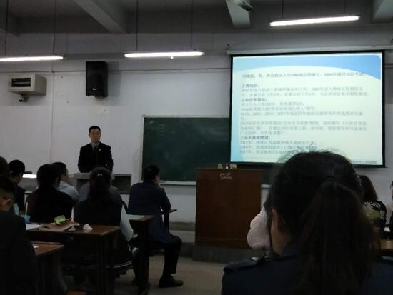 刘检察官首先从自己的工作经历讲起,根据多年来的工作经验,比较了检法,律师、企业法务、一般公务员在职业收入、法律素养、职业发展、职业环境、职业心态五个方面的发展前景,以我是什么样的人?我能干什么?干什么使我最快乐?提出了进行职业选择的方法,希望同学们对比分析决定自己的职业选择。